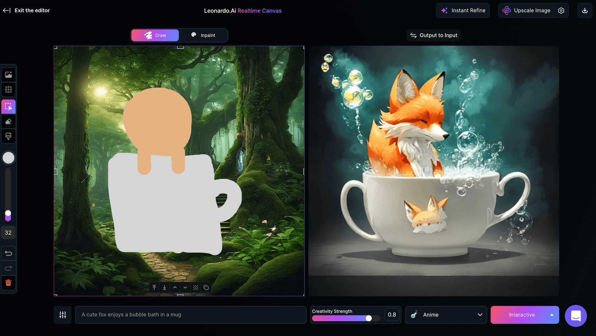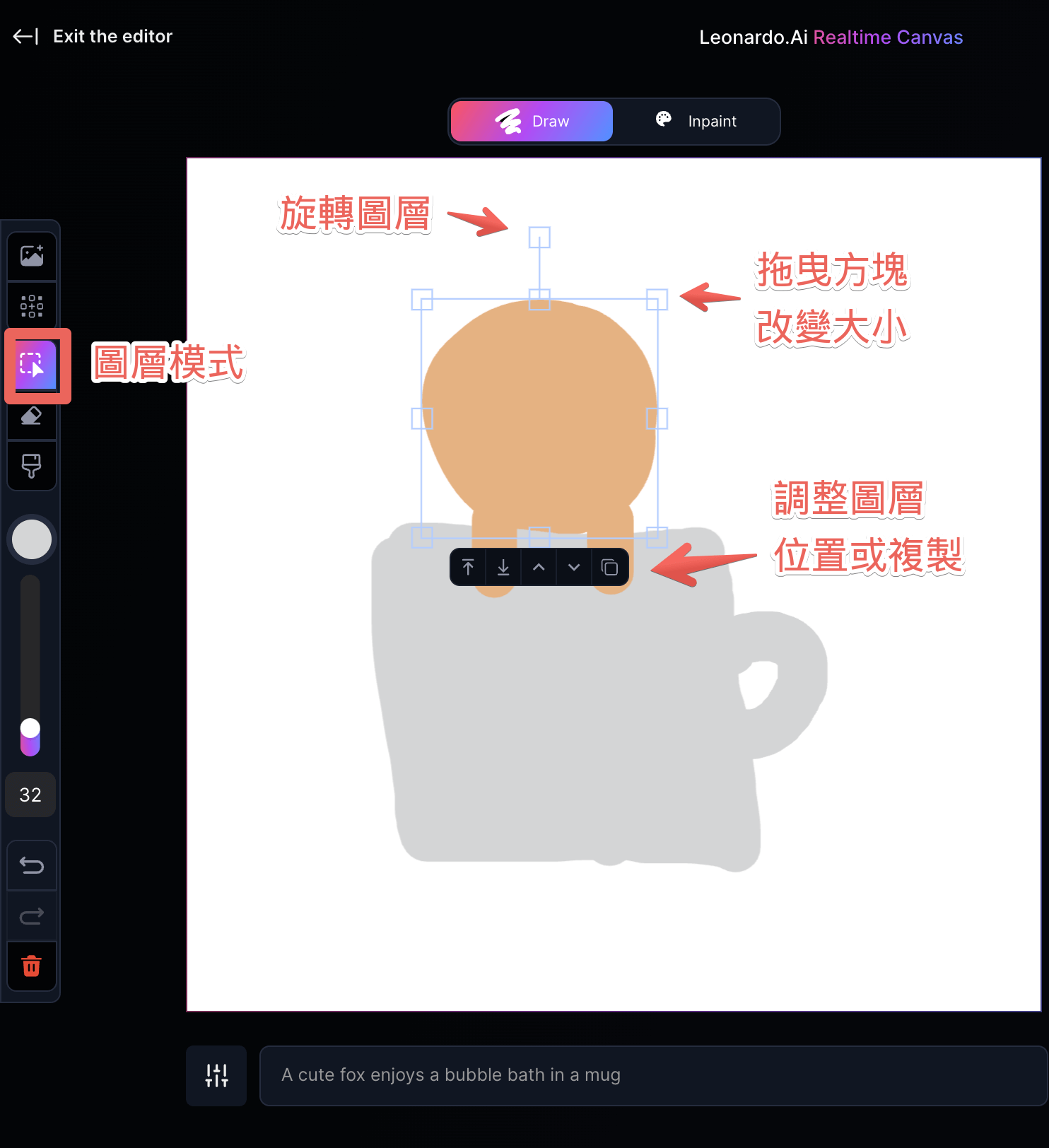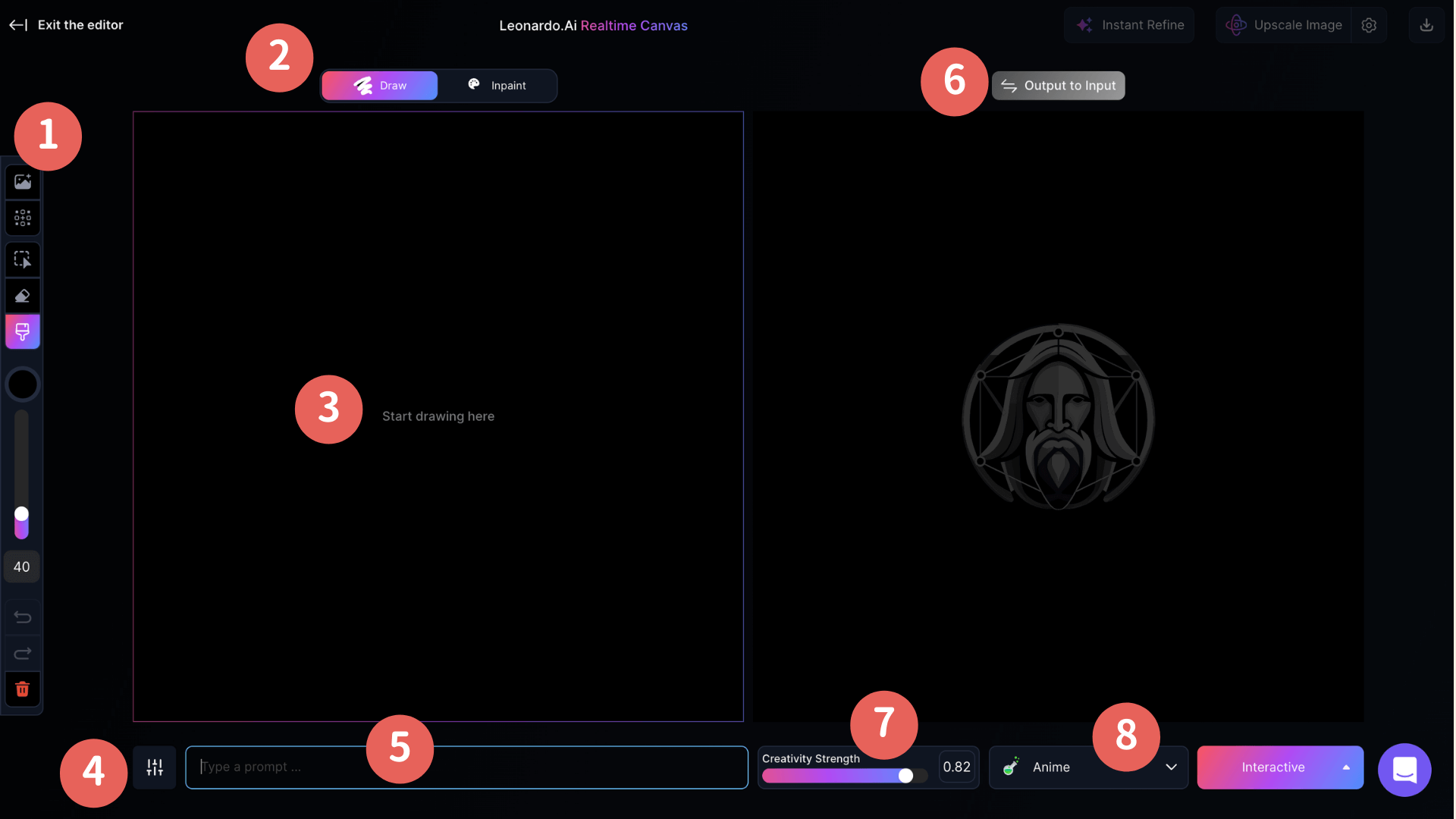 Realtime Canvas,翻譯過來就是「即時畫布」,這是Leonardo AI在影像轉換技術方面最新創新的功能,可以立即將畫布中的繪圖轉換為你意想不到、令人驚嘆的藝術作品,徹底改變使用者與人工智能互動以產生圖像的方式,提供了一種身臨其境、直觀的創作過程,感覺就像在數位畫布上繪畫一樣自然。
