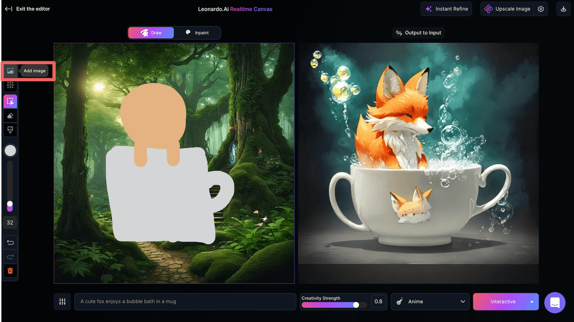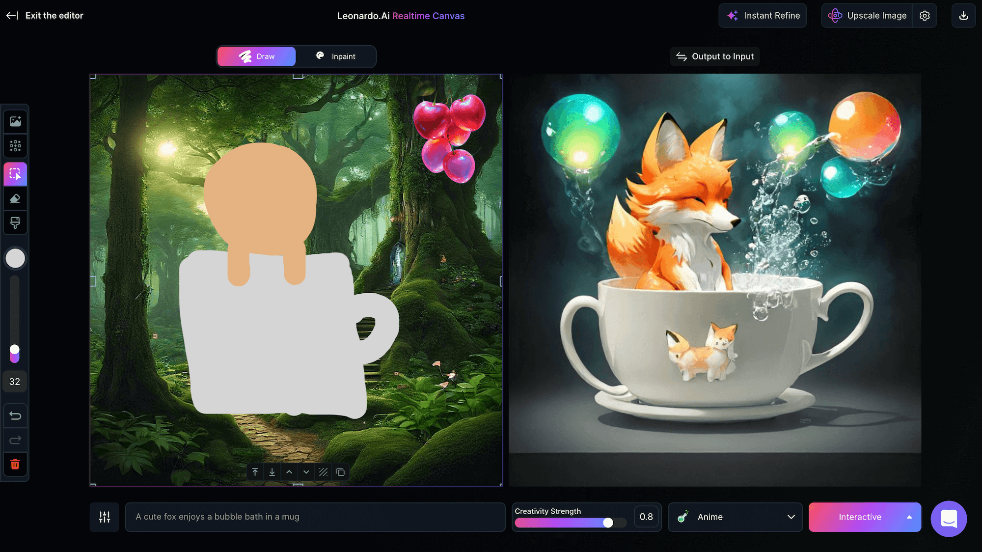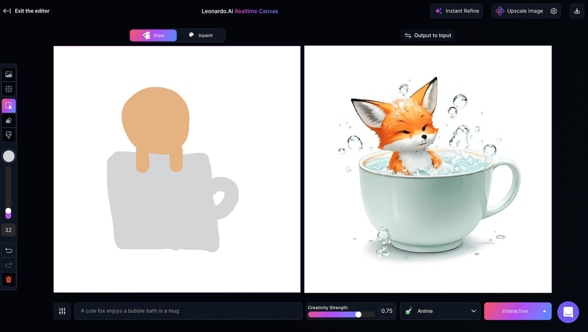 Realtime Canvas,翻譯過來就是「即時畫布」,這是Leonardo AI在影像轉換技術方面最新創新的功能,可以立即將畫布中的繪圖轉換為你意想不到、令人驚嘆的藝術作品,徹底改變使用者與人工智能互動以產生圖像的方式,提供了一種身臨其境、直觀的創作過程,感覺就像在數位畫布上繪畫一樣自然。