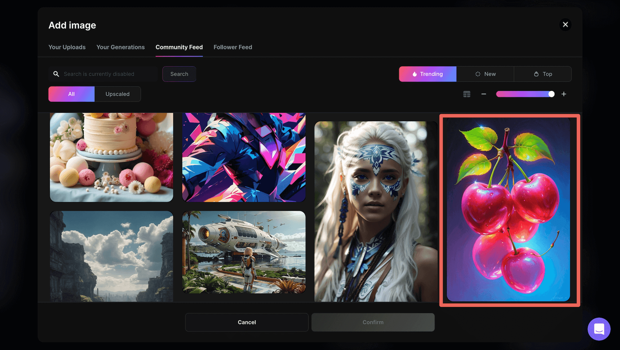 點選「Add image」,可以選擇過往上傳的圖片、自己的生成結果、社群圖、追蹤者的圖⋯⋯等等。